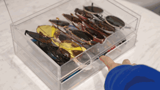 像这样用透明的亚克力盒子收纳墨镜更有利于我快速的看到我所有的墨镜,并且拿到我想要的那一副。Muji的亚克力盒子会定期有活动,我记得只要10美金一个,我都是在那时买的。